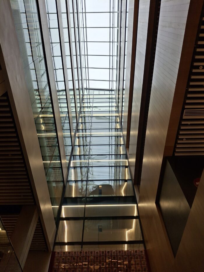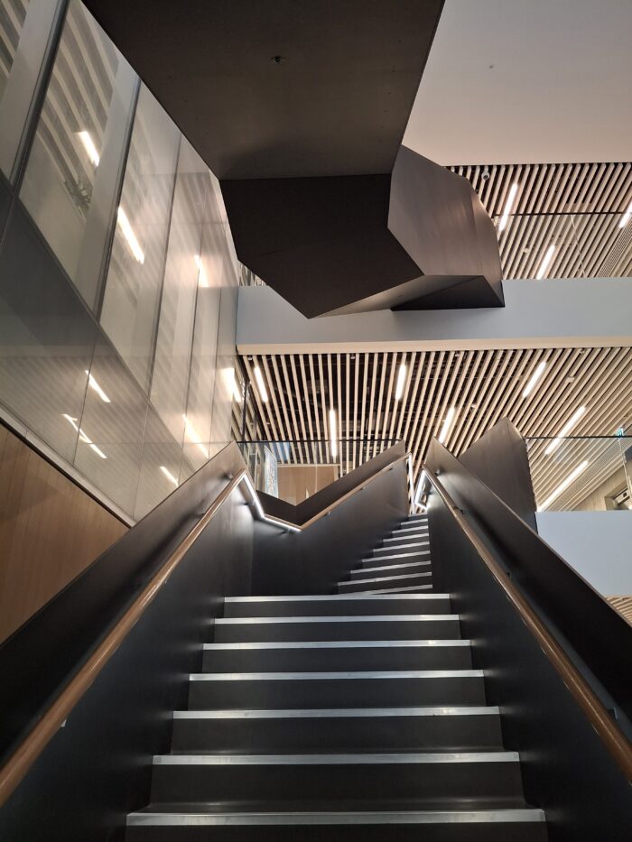 Druhý den mé dobrovolnické exkurze jsem dobrovolničil v kampusu RCSI, tedy v Royal College of Surgeons in Ireland, na dublinské York Street č. 26. Jedná se o lékařskou univerzitu specializující se na chirurgii a patřící mezi top světové instituce v tomto oboru. Moderní, špičkově vybavenou, „state-of-the-art“ budovu o 10 podlažích (šesti nadzemních a čtyřech podzemních) navrhla kancelář architekta Henryho J. Lyonse, jednoho z předních současných irských tvůrců. Výstavba trvala pouze dva a půl roku a stála celkem 80 miliónů EUR. V nadzemních patrech se nacházejí např. dvoupatrová knihovna, zkušební operační sály a laboratoře, výcvikové nemocniční pokoje, velké posluchárny i menší učebny. V podzemních částech mají studenti k dispozici např. tělocvičnu s basketbalovým hřištěm a posilovnou či další zázemí pro studium a výzkum. Jedním z dominantních detailů je spirálovité schodiště spojující patra č. 3 až 5 (přízemí je označeno jako 0), vyrobené z oceli a irského dubu. Celým prostorem kampusu RCSI prostupují principy vzdušnosti, otevřenosti, světlosti a práce s detaily i kvalitními materiály. Prostředí a dojem z něho dotvářejí např. i takové maličkosti, jako velkoformátové skleněné tabule s polepem v podobě malých bílých teček. A proč jsou všechna okna polepená zrovna bílými tečkami? Jelikož je fasáda směrem do ulice orientovaná na sever, architekti se museli vypořádat s nedostatkem světla proudícím dovnitř do budovy z tohoto směru – což vyřešili právě zmíněným polepem skel, odrážejícím světlo a zvyšujícím jasnost uvnitř i vně budovy.