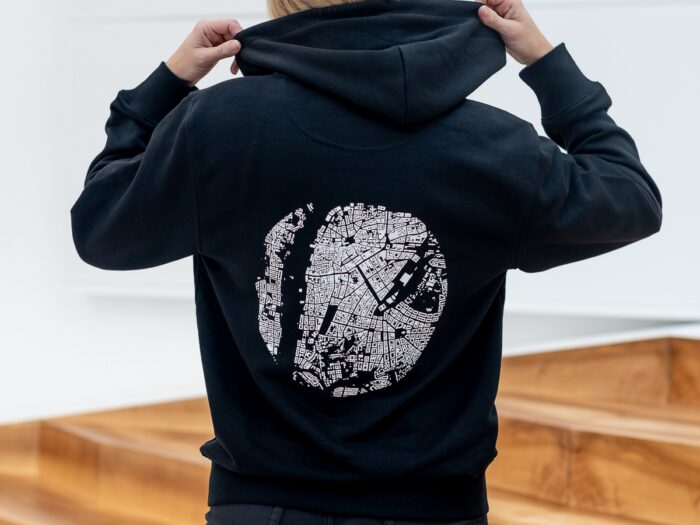 With long winter months ahead, we have also made cozy new unisex hoodies. Produced from organic cotton, they come with a Schwarzplan print on the back, which we previously debuted during this year’s Open House Prague festival as part of the limited edition of apparel. Schwarzplan is appreciated mainly by architects because it shows the urban structure of a city, but we guarantee you that anyone will look stylish in these pieces. 😉 You can choose from two colors (black and white) and styles (with or without a zipper). Any clues as to what part of the city is shown?