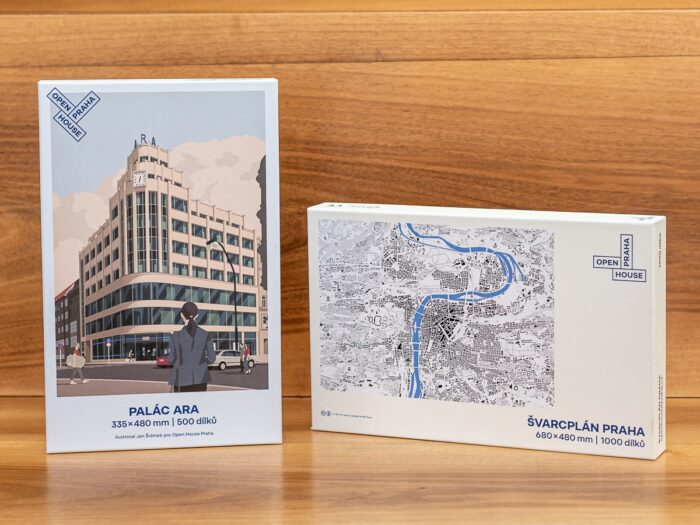 Is there a better way to let off steam than by doing jigsaw puzzles? The architecture-themed puzzle series are the new items in this year’s product range. You can use them as gifts for your loved ones and enjoy fun holidays together. Those who are up for a challenge will welcome the 1000-piece puzzle with Prague Schwarzplan, and those who enjoy functionalist architecture will love the 500-piece puzzle with ARA Palace created by illustrator Jan Šrámek.