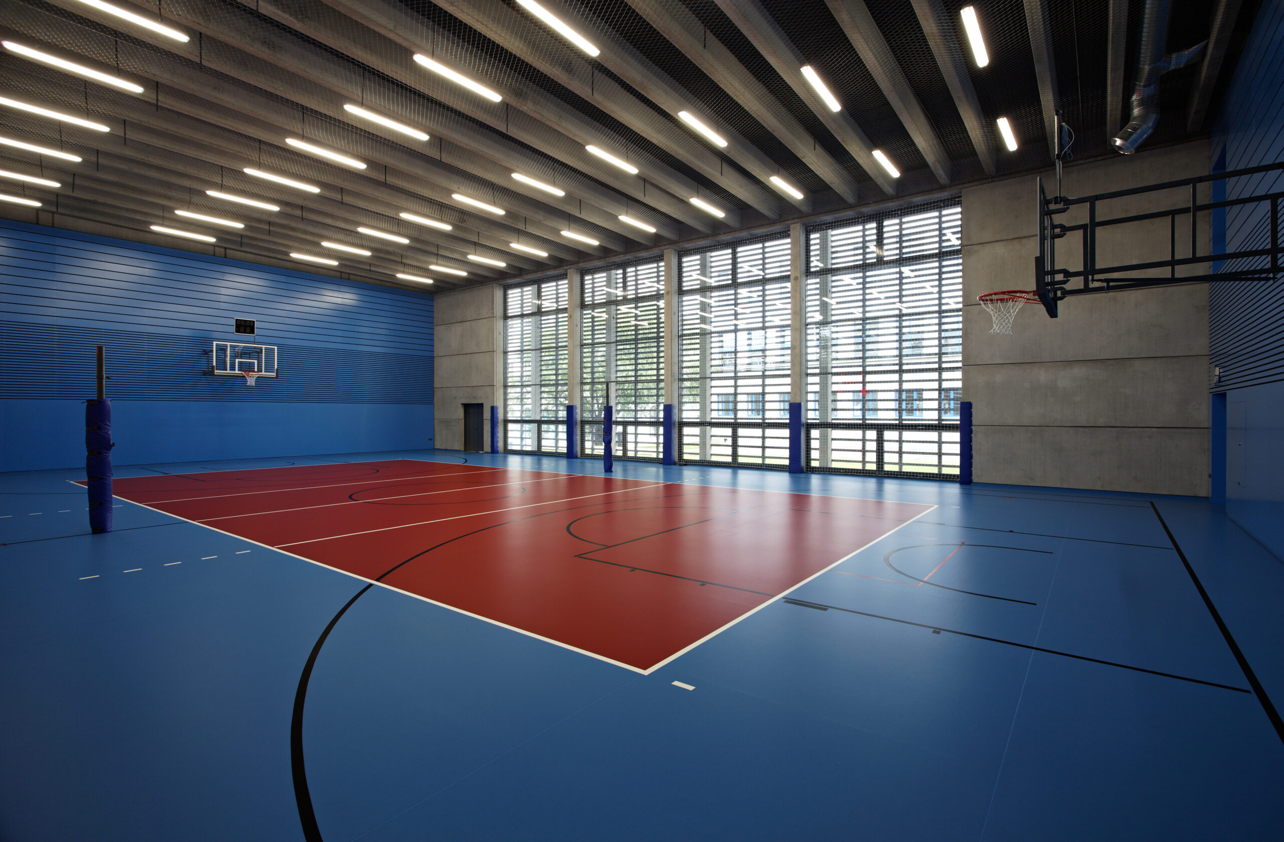 Related to the question of heritage is the need for dialogue: how to approach an architecturally valuable building and add contemporary values in addition to capacity? Sporadical, for example, has proposed an elegant solution. It designed an extension to the functionalist building of the Johannes Kepler Grammar School from the 1930s, made of exposed concrete. The gymnasium building still retains its blue window frames, and the colour scheme of the extension follows this element: the interior is dominated by a light blue shade, while the grey tones of the newly added gymnasium respond to the vertical articulation of the main building. The lowest floor of both the old and the new building is clad in dark grey artificial stone. What is particularly remarkable about the realisation is that it openly acknowledges a different period of creation. It does not pretend, it does not historicize. Yet it is sensitive to its surroundings and fits in perfectly given the terrain.
